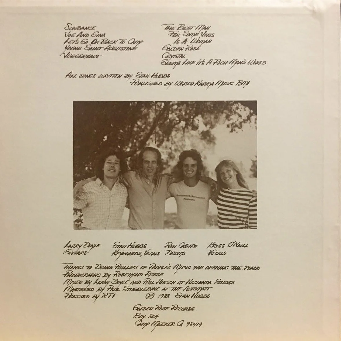 Original copies show a Camp Meeker PO Box address (“Box 504”) at the bottom of the back cover and original copies included a small booklet of lyrics and artwork for the album (see images below).
